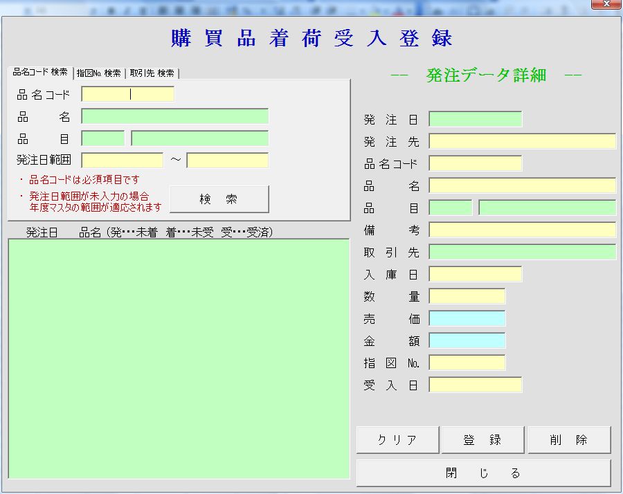 購買品着荷受入登録 画面